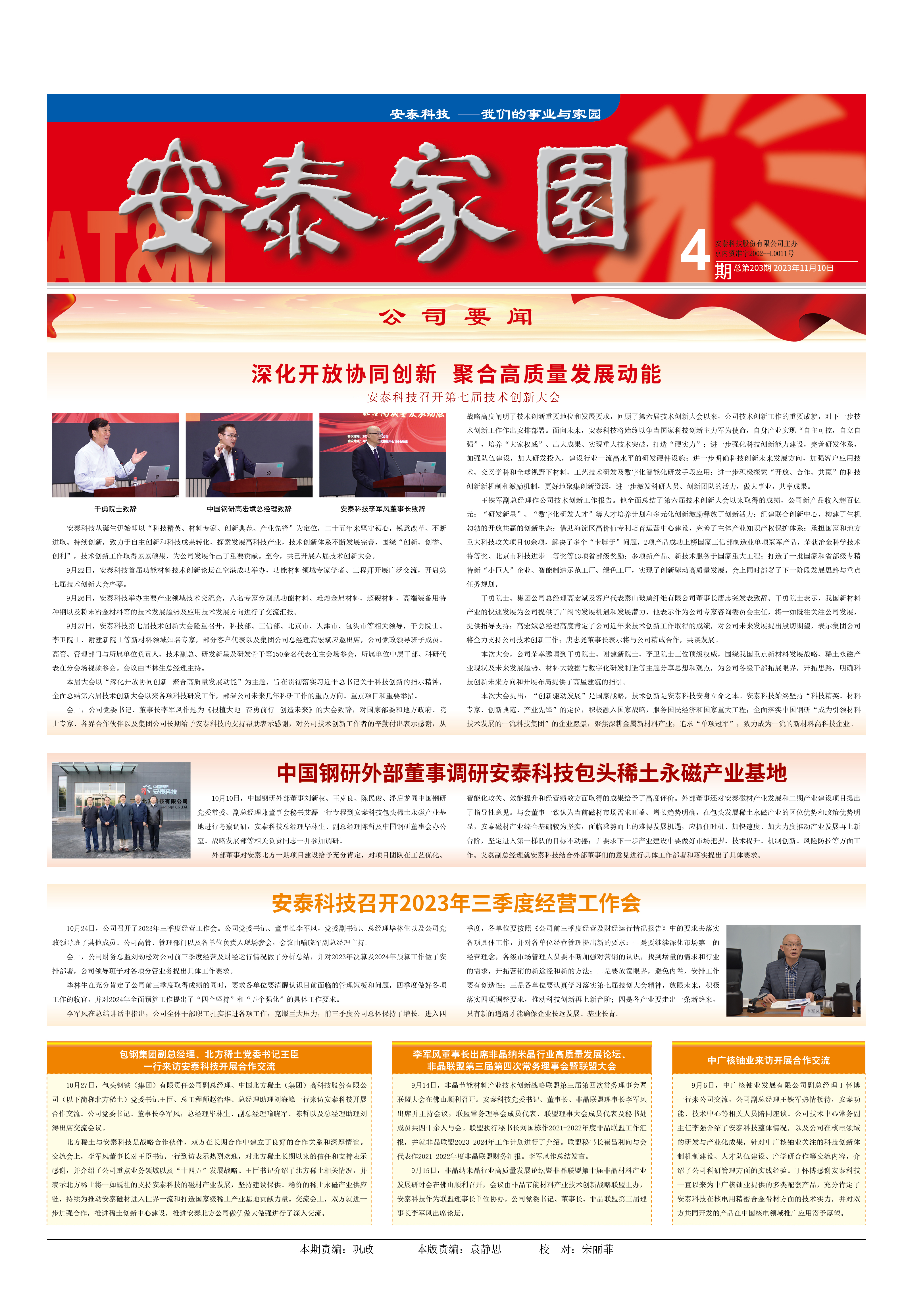 本次大會提出:“創新驅動發展”是國家戰略,技術創新是安泰科技安身立命之本。安泰科技始終堅持“科技精英、材料專家、創新典范、產業先鋒”的定位,積極融入國家戰略,服務國民經濟和國家重大工程;全面落實中國鋼研“成為引領材料技術發展的一流科技集團”的企業愿景,聚焦深耕金屬新材料產業,追求“單項冠軍”,致力成為一流的新材料高科技企業。
