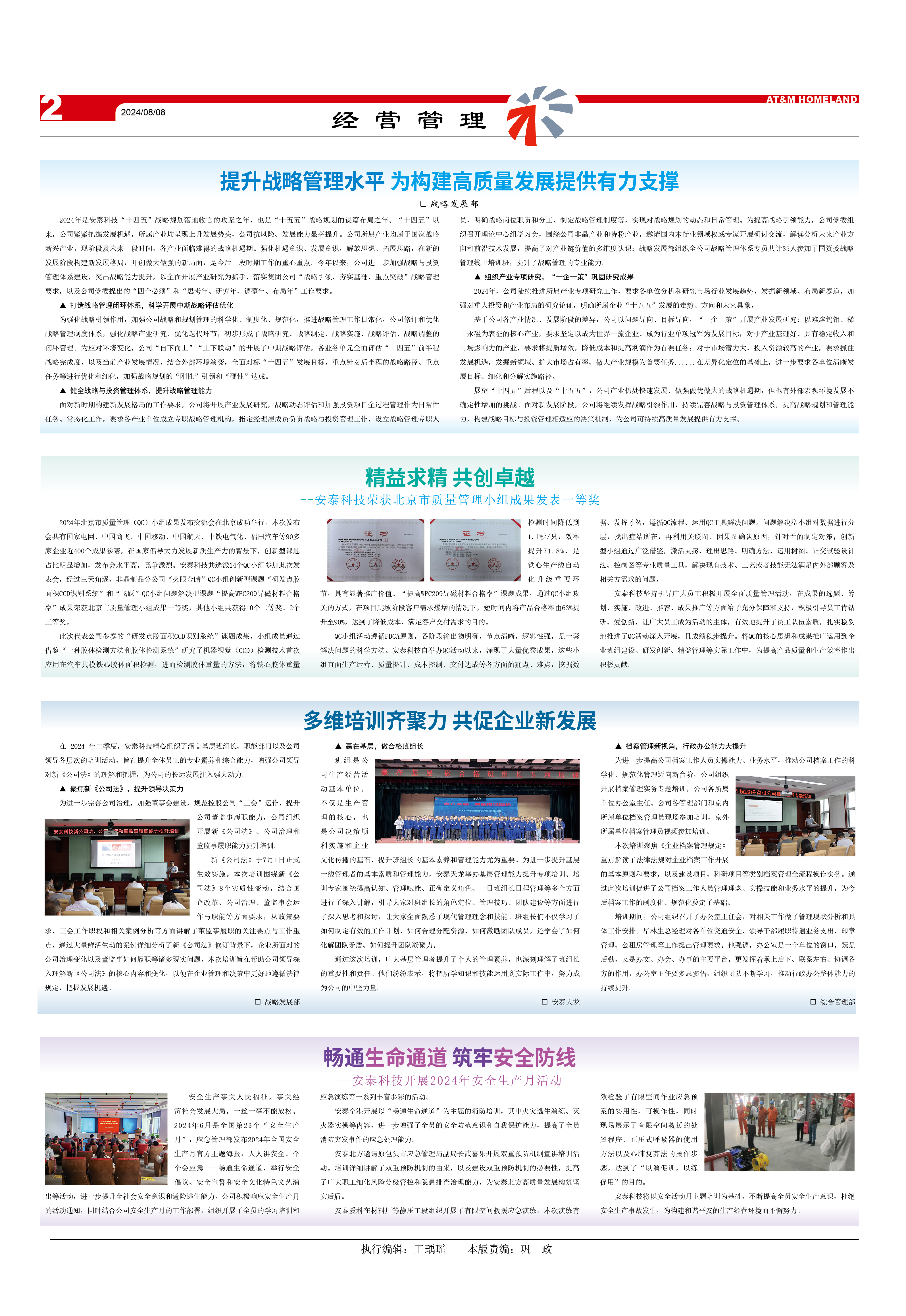 2024年是安泰科技“十四五”戰略規劃落地收官的攻堅之年,也是“十五五”戰略規劃的謀篇布局之年。“十四五”以來,公司緊緊把握發展機遇,所屬產業均呈現上升發展勢頭,公司抗風險、發展能力顯著提升。公司所屬產業均屬于國家戰略新興產業,現階段及未來一段時間,各產業面臨難得的戰略機遇期。強化機遇意識、發展意識,解放思想、拓展思路,在新的發展階段構建新發展格局,開創做大做強的新局面,是今后一段時期工作的重心重點。今年以來,公司進一步加強戰略與投資管理體系建設,突出戰略能力提升,以全面開展產業研究為抓手,落實集團公司“戰略引領、夯實基礎、重點突破”戰略管理要求,以及公司黨委提出的“四個必須”和“思考年、研究年、調整年、布局年”工作要求。